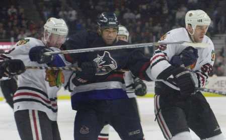 Brashear of Vancouver falling back while Spacek (left)and Daze (right) hold him up.