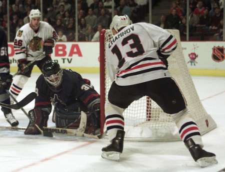 Zhamnov tries to poke one past Cloutier while Sullivan in background watches on.