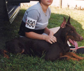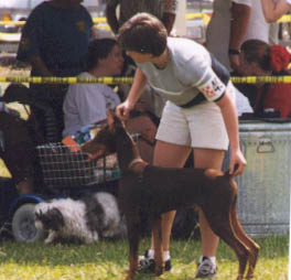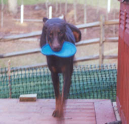 Lance is a wonderful dog. He's the last of our dobermans, raised by our wonderful 13 year old bitch right before she died. He can be a little scared towards things, and has a few social skill kinks, including seperation anxiety and paranoia. We call him "velcro dog". He is constantly by your side. He can be a problem in the house if he doesn't have enough attention, but once he's outside, running with Maya or playing catch or frisbee, he's the most beautiful and amazing thing you've ever seen. He's absolutly beautiful, but due to his few mental flaws, he has been neutered and will not be bred to continue the kennel. His show career was short lived as well-- He was absolutly gorgeous in the ring but he hated it, could not stand the sight of other dogs and people and would get so nervous. As soon as we noticed this, we took him out. After all, it doesn't matter how beautiful the dog is--if he isn't happy, nothing is worth it. Here are a few pictures of Lancy-boy.