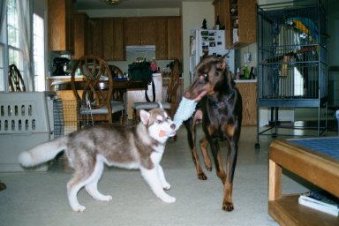 This is Maya and Lance playing Tug-o-War. The duck in between them was Lance's teddy when he was Maya's age, and Maya wants her turn at it. Lance is very good about letting her have his toys, and vice-versa, but sometimes, they end up in a Tug-o-war game to end all others!