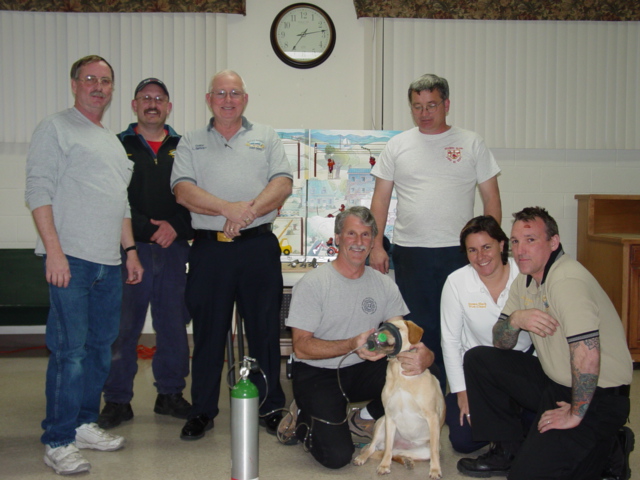 At the March 2008 meeting the Dare County chapter of the SPCA was on hand to demonstrate the pet oxygen masks they donated to several local fire departments to aid dogs and cats during fire emergencies. Pictures from the left are: Jimmie Hooper, Salvo VFD; Sean Huffman and Lowell Spivey, Kitty Hawk FD; Paul Cagiano and Katy, Dare County SPCA; Mike Hekking, Roanoke Island VFD; Donna Black, Duck FD and David Bein, Colington FD. |