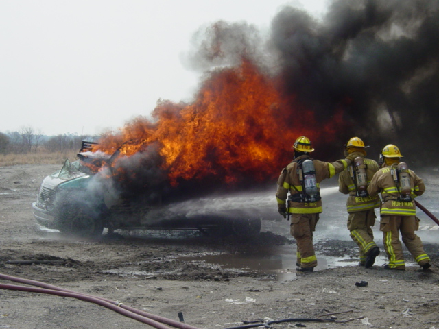 Firefighters tackle a well involved vehicle fire during Firefighter level I and II training at the Dare County Landfill. Classes are taught regularly throughout the county. |