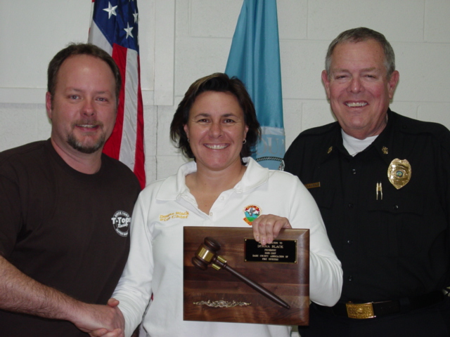 At the March 2008 meeting, Donna Black, Chief of the Duck Fire Department was recognized for serving the Association for 3 years as President, from January 2005 through January 2008. Pictured are Colington Deputy Fire Chief and Association President Glenn Rainey (L) Chief Black and Dare County Fire Marshal and Association Secretary Doug Remaley. |