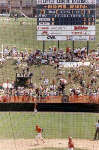 I took this picture just after the boy rounding second had hit the longest home run in World Series history. The ball was caught on the hill to the left of the scoreboard (see box). Click the pic to get a close-up of the image in the box - a fan holds up the ball where it was caught!