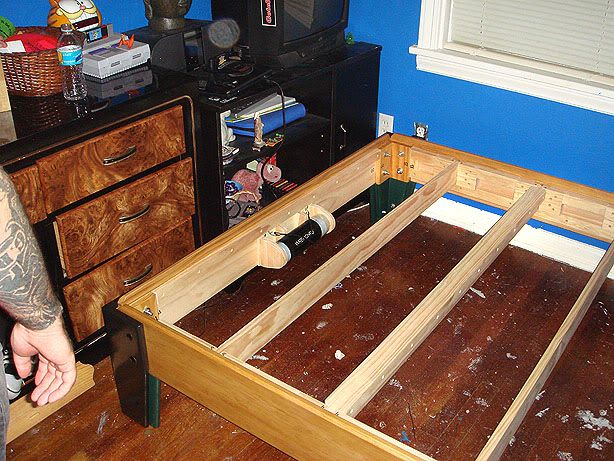 Each "T" shaped crossmember end fits into a corresponding "T" shaped socket in the bed rail (see next photo).