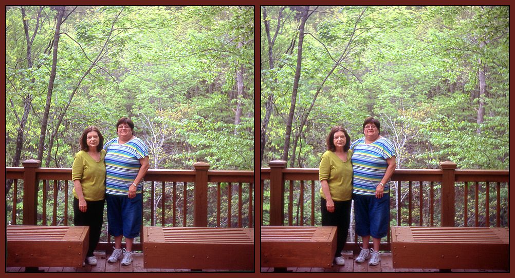 the sisters, Darlene and Louann, on the deck above the Grandview Peaks waterfall