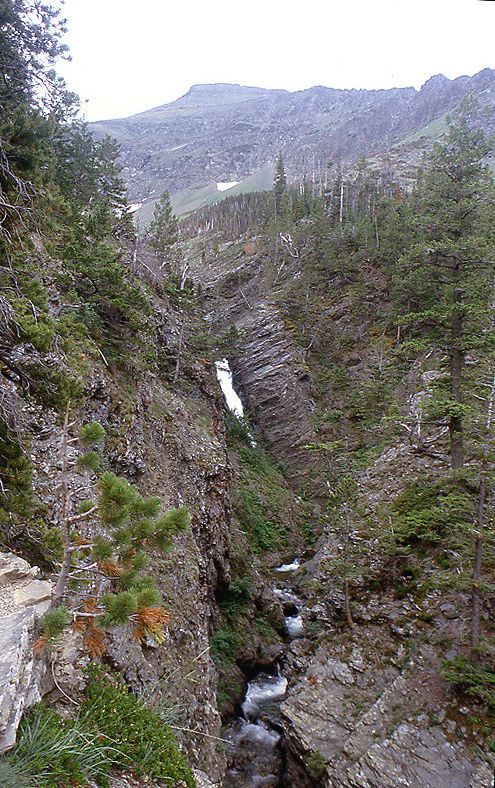 A waterfall seen from a trail in a rugged area of Two Medicine
