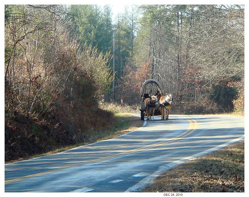 Seen on Vein Mountain Rd. Christmas Eve morning: A two horsepower, rubber tired, covered wagon occupied by a man and two dogs.