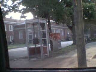 There's this craaaaaaazy mother fucker that thinks he's superman... he fucking dresses in there... but here's the problem... he's really damn big, and whenever he turns around his ass and genitals streak across the glass. It's sick, dude. Then he runs out of the phone booth screaming "The British are coming!! The British are coming!!!" Then he pulls out this cap gun and shoots it at people walking down the sidewalk. In the background is the courthouse and the police department. HE DOES THIS RIGHT IN FRONT OF THE FUCKING POLICE!!