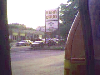 Speaking of cops... this is a picture of a drug bust! I'm fucking serious! We were sitting in the parking lot at the store on the sign, and this car drove by... then around 10 cop cars and 5 unmarked cars swarmed in behind him, boxed 'em in, jerked the black dudes out the car, and threw 'em on the hood! Rain just happened to have her digital camera in the car, so we got a picture of it! So fun! Rain also had some weed on her, so she slid down in there seat, cause she's a paranoid bitch. She thought they were coming after her!! AND THEY STILL ARE, GODDAMMIT!!