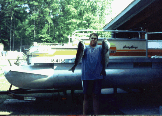 This is my son, Jason. He caught these two stripers at Santee Cooper, SC. The total weight of this haul was right under 20 pounds.