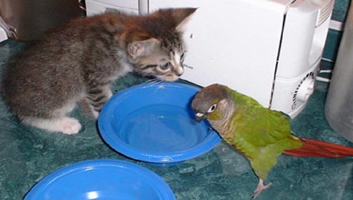 Blue, the Blue Crown Conure and Tie, the Green Cheeked Conure bathing.