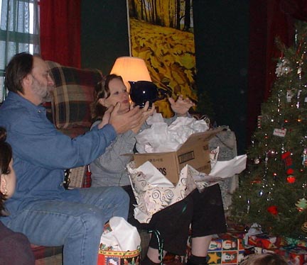 Mom and Dad opening the Fiestaware teapot.