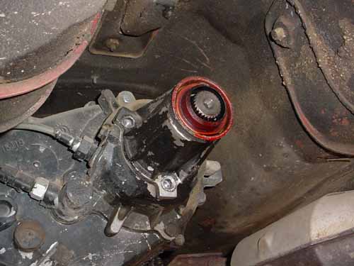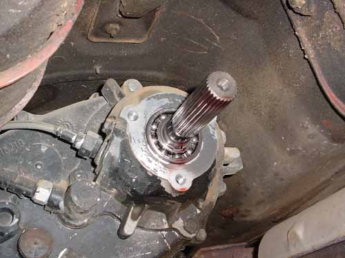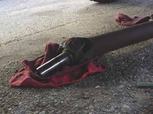 Step 2: Out comes the old driveshaft. It had some nicks/roughness on the yoke, which would explain the drip I was getting out of the tailcone seal.