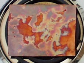 | As the copper gets hotter, the colors are replaced with a black coating of cupric oxide. This is not the oxide we want, but it will flake off later, showing the reds, oranges, pinks, and purples of the cuprous oxide layer underneath. |