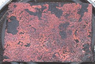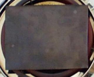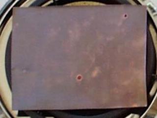 | When the copper has cooled to room temperature (this takes about 20 minutes), most of the black oxide will be gone. A light scrubbing with your hands under running water will remove most of the small bits. Resist the temptation to remove all of the black spots by hard scrubbing or by flexing the soft copper. This might damage the delicate red cuprous oxide layer we need to make to solar cell work. |