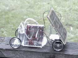 I bought a fuel cell car experimentation kit Here it's really cool, this little car actually goes at a good walking pace. It's powered by solar hydrogen, which means that the solar panel powers the fuel cell, which makes hydrogen. Then the car drives on the hydrogen. The fuel cell basically functions as a battery, when fully charged the tanks hold enough for the car to go for five minutes or so, the charge time appears to be close the the use time which means five minutes of sun, stored in the form of hydrogen make five minutes of drive time in the shade, but because of the hybrid feature, when the sun is out it actually charges while it drives. And when the sun goes behind a cloud or the car goes into a shadow the suns stored energy kick in from the fuel cell. It is truly amazing, the power of the sun.