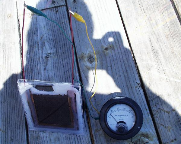 the meter now reads about 4 microamperes, since no sunlight is falling
