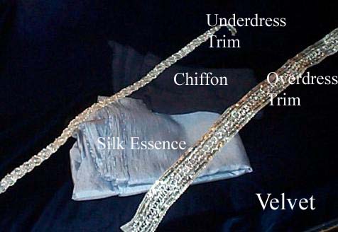 As of today, I have gathered all materials except for the lower sleeve fabric and I finished the beading on one of the upper sleeves. I have also taken a few pictures. I can already tell that this velvet is going to be really hard to photograph. It looks dark in the pictures, but it's really not that dark. Here's a picture of my fabrics and trim (I realized later that I accidentally labeled the underdress trim as the overdress trim and vice versa. Sorry about that):