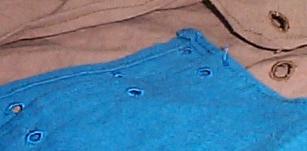 First try on the underdress, I made it as just two panels of fabric with sleeves. After this was done, I saw pictures proving that the dress had a waist line. I decided to be more accurate, so I cut the dress at the waist (with a point in the front) and put the skirt back on with the slit all the way up the front. For the slit, I just picked out the stiching in one of the (former) side seams. The lower sleeves lace up. It makes them very form fitting and it's also easier to secure them when I roll them up. I bought some blue ribbon that matches the fabric to lace up the sleeves with. All of the eyelets were sewn by hand; here's a picture: