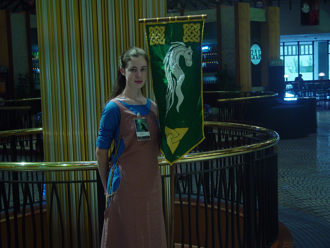 I bought white linen and dyed it (in the washing machine) for the surcoat. I dyed it once, and I thought it was a complete disaster; the dye just seemed really uneven. I hung the fabric on the clothesline to dry and somehow the dye evened out and it looked nice. The only problem was that the dye was a lot lighter than I wanted it to be. Here's a picture: