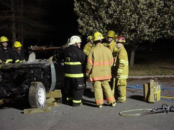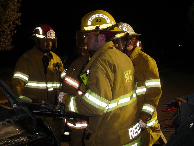 Firefighter Robbie Reed cuts with the hurst cutters, as Assitant Chief Todd Tilley & Captin Drew Woodard look on.