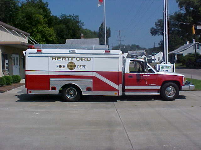 Truck 34, 1992 Chevorlet 3500 Hackney Rescue Truck 5-kw generator supplies 4-telescopic scene lights & 2- 200ft electric power reels with lines.This Rescue truck carries hurst powered extrication tools, including, speaders, cutters, rams, air bags,air chisel. 2 sawzalls, 2 high lift jacks,a powersaw, cribbing and other assorted hand tools for rescue operations.