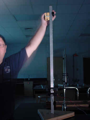 Setup gravity drop apparatus with photogates approximately 5 cm apart measured to the nearest 0.1 cm. Measure this distance from the middle of one eye to the middle of the other eye. Also measure distance from bottom of ball to the middle of the top photogate eye. Set timer on interval. Release ball and record the time. Repeat at the same settings. Move the release mechanism further down the stand making the same measurements. Continue until you have the time interval at 6 different distances. Repeat using the other type of marble. Calculations: Use the average time interval for each displacement. Calculate the average velocity at each displacement. The displacement used to calculate the average velocity is the distance between the photogates. The displacement used to calculate the acceleration is the distance from the bottom of ball at rest to the mid point between the photo gates. The initial velocity and initial displacement are 0.