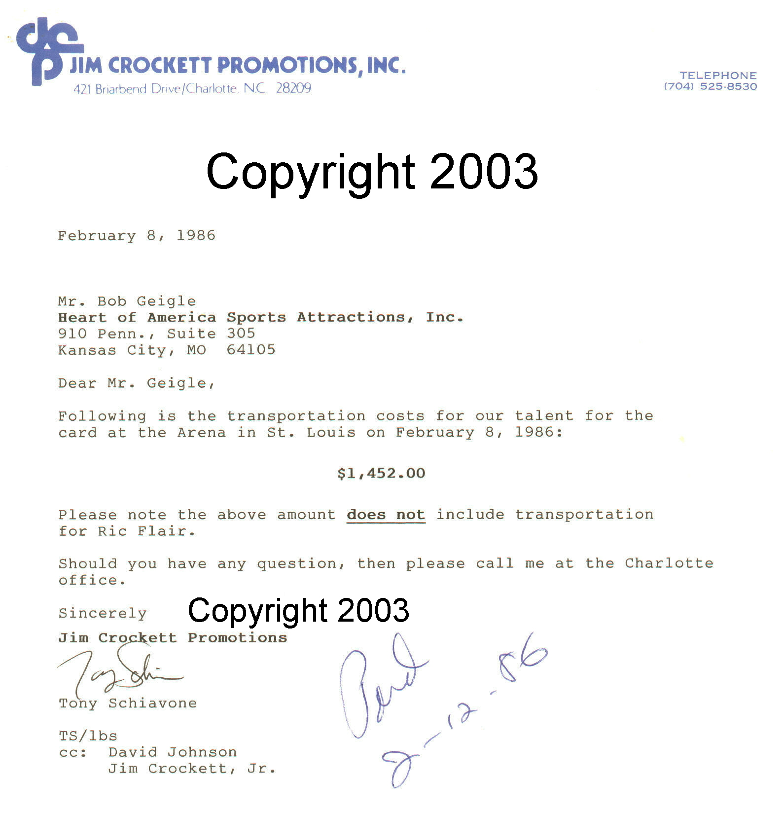 Jim Crockett Promotions (Mid-Atlantic Wrestling)correspondance concerning travel costs of using JCP talent in St. Louis. The letter clearly defines that the cost(s) does NOT include the legendary Ric Flair. Dated February 8, 1986. Notes: Since Flair is specifically mentioned in the letter as NOT being included in this billing, it would lead me to speculate that Flair's flamboyount style of Limosiunes and the like would cause his transportation fees to be slightly higher!