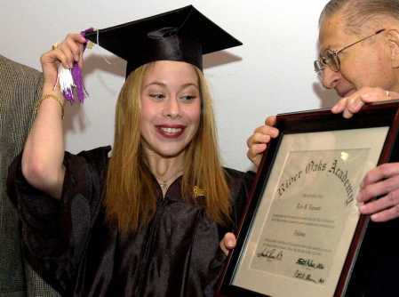 Olympic gold medal figure skater Tara Lipinski, left, moves her tassle as she receives her high school graduation diploma from Eugene Caldleugh Thursday, May 18, 2000 in Houston. Lipinski graduated from River Oaks Academy in Houston. (AP Photo/David J. Phillip)