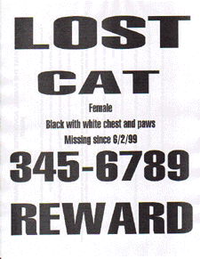 Place flyers around your neighborhood and at the major road intersections where the pet was found.