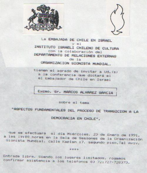 El Instituto Israeli Chileno de Cultura, la Embajada de Chile en Israael y el Dpto. de Relaciones Externas de la Organizacion Sionista Mundial, invitan a la conferencia dle Embajador de Chile, Marcos Alvarez Garcia, sobre el tema:
