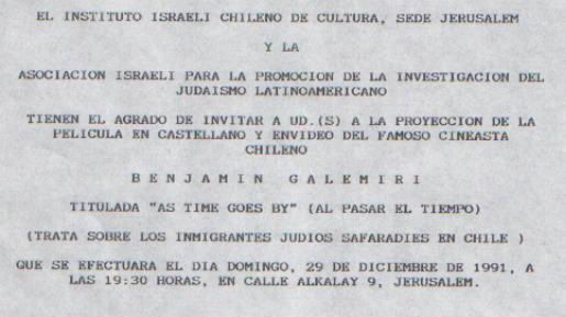 Proyeccion de la pelicula del famoso cineasta chileno Benjamin Galemeri, "Al Pasar el Tiempo", el 29.12.91, organizada por la Sede Jerusalen del Instituto Israeli Chileno de Cultura y la Asociacion Israeli para la Investigacion del jusaismo Latinoamericano.