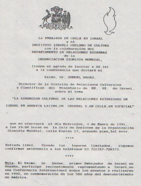 El Instituto Israeli Chileno de Cultura y el Dpto. de Relaciones Externas de la Organizacion Sionista Mundial invitan a la conferencia del Sr. Shmuel Hadas, Director de la Division de Relaciones Culturales y Cientificas del Ministerio de RR. EE. de Israel, sobre el tema:
