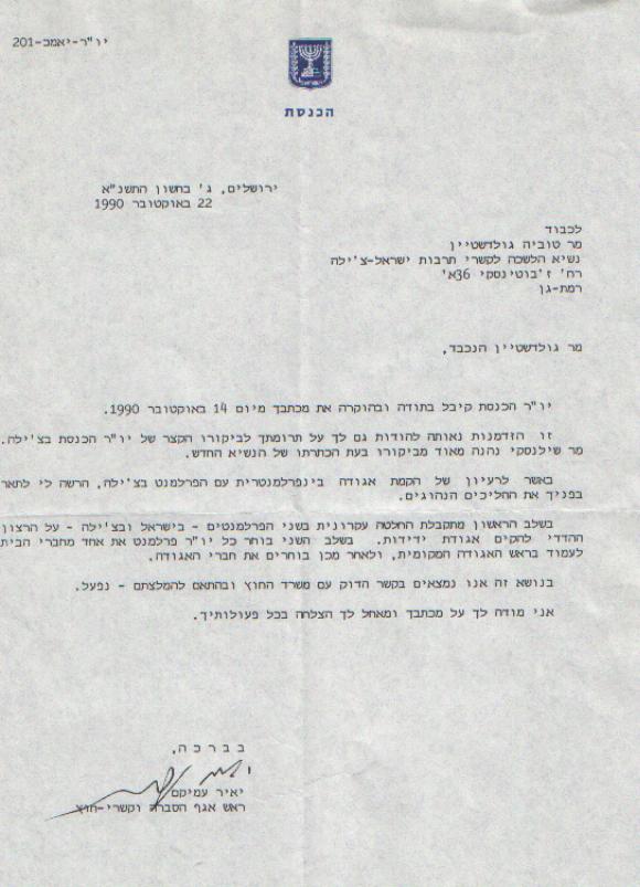 Carta respuesta de la Kneset agradeciendo y aceptando la proposicion.