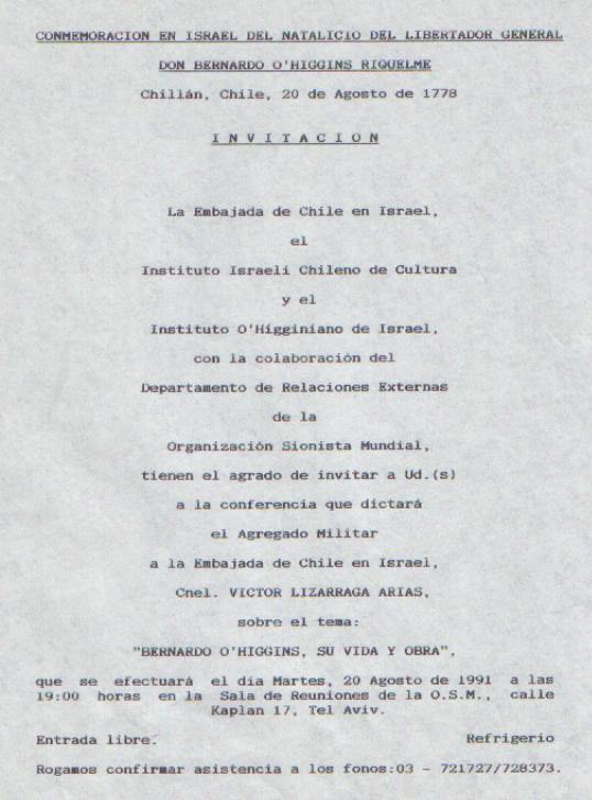 Conmemorando el natalicio del Libertador General don Bernardo O'Higgins R., el Instituto Israeli Chileno de Cultura, la Embajada de Chile en Israael y el Instituto O'Higginiano de Israel, invitan a la conferencia del Agregado Militar de la Embajda de Chile en Israel, Crnel. Victor Lizarraga Arias sobre el tema: