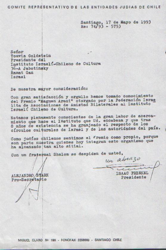 La Federacion Israeli de Asociaciones de Amsitad Bilaterales, institucion que reune a mas de 70 asociaciones, ha otorgado al Instituto Israeli Chileno de Cultura e Instituto O'Higginiano de Israel, presidido por el Cdor. Touvia Goldstein, su mas alta distincion, el Presmio "Maguen Arazi", que se entrega por decision b-anual de un jurado especialmente designado, a la Asociacion de Amistad y Cultura mas activa en Israel.