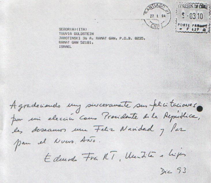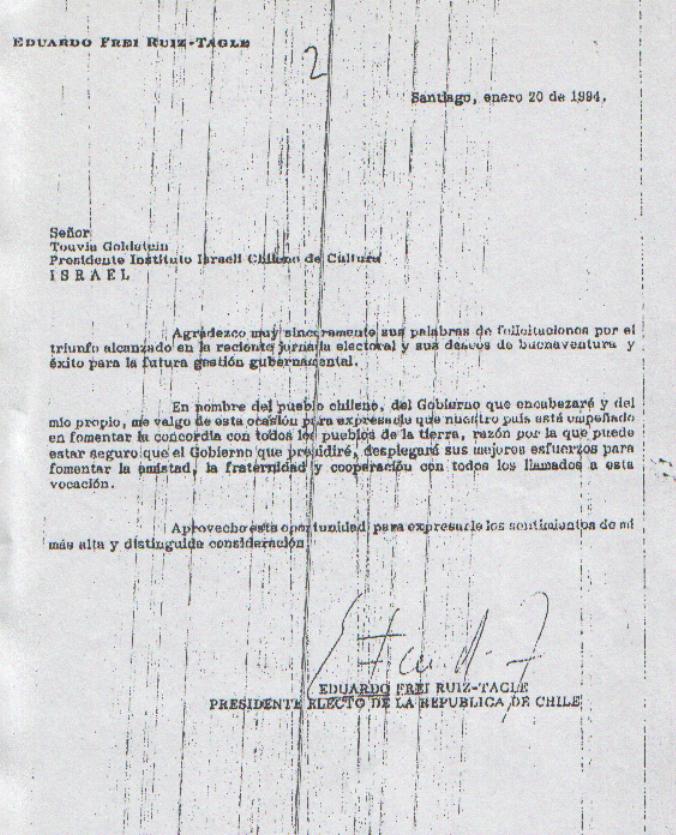 Presidente Eduardo Frei Ruiz-Tagle, agradece felicitaciones enviadas por su eleccion.