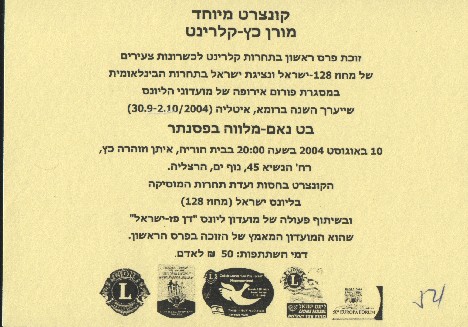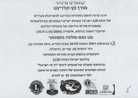 Add in the Tel Aviv Concervatorium announcing the final stage of the Lions Israel Clarinet Competition..