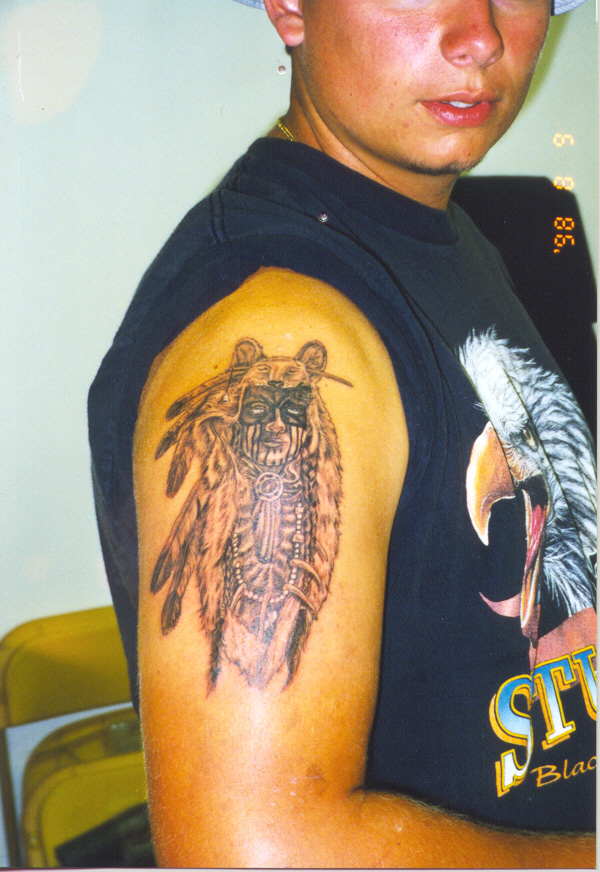 Why did I decide on a Tattoo of a Native American? Well, I had been searching for something I would want on me for the rest of my life and did not find anything for aprox. a year and a half. I have a small percentage of Blackfoot Indian in me so I figured that is something to be proud of. The only problem is that I could not find any pictures of my ancestors that I liked because most of the pictures I found were takin fairly recently or were artist depictions of what the Blackfoot Indian would look like. Well if you don't know already I traveled to Sturgis, South Dakota with my parents for Bike Week, little did I know I would finally find what I was looking for. I did not expect to get a Tatoo for a long time, I was not really even thinking about the idea. We have alot of friends that travel to Sturgis every year from all over the country. There happens to be a couple from New Mexico, Dennis, Leta, and their son William Le Blanc, who are Natives of the Pueblo Nation. To make a long story short, one day Dennis was wearing the shirt in the picture and I saw the design on it, which happened to have been painted by another Pueblo Indian, and knew right away that that was what I wanted on my arm for the rest of my life. I asked him if I could barrow the shirt, ofcourse he let me and I went to town and made an apointment with Bob Montagna, who also happens to be the Le Blancs' new tatoo artist, and had my peice done. And thats how I decided on my Tat.