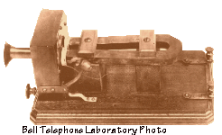 One of Bell's first 'telephones' was based on this Liquid Transmitter. Bell filed his patent on February 14, 1876. It was on March 10th, that his famous words "Mr. Watson---come here---I want to see you" were spoken over a telephone using a liquid transmitter. Bell's assistant Mr.Watson was the first to hear speech transmitted by a telephone. Bell was shouting in a microphone in another room as he had spilt acid on his trousers and was shouting for help. Mr.Watson had heard the shouting which had been picked up by the microphone,and transmitted through a wire to the receiver. However, the spoilt trousers were quickly forgotten as the success of the experiment dawned on them. |