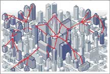 beams flashing across high-rise buildings in the metros, bombarding gigabits of