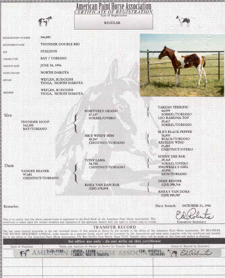 Thunder Double Bid was born on June 4, 1996. He is bay