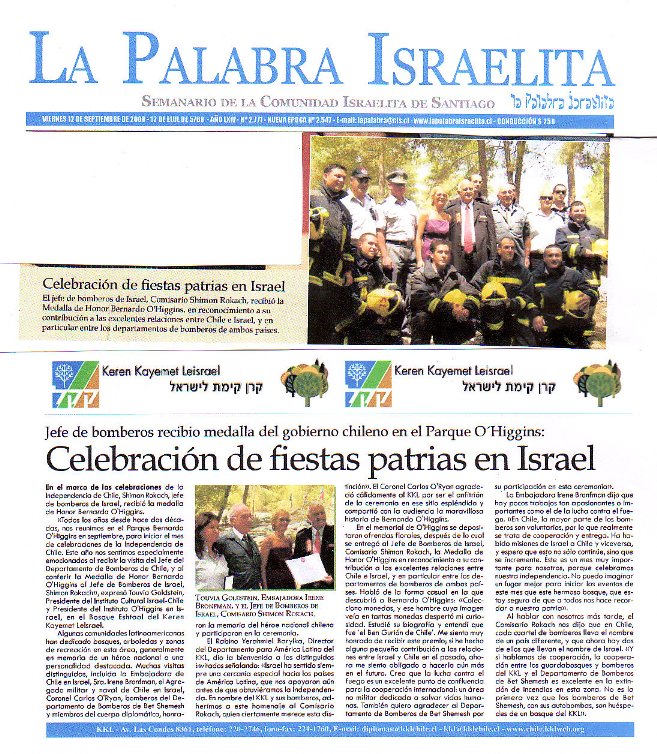 Publicacion en KOL Hair de Jerusalen sobre el Acto Civico en Homenaje a O'Higgins en la Explanada B. O'Higgins y el otrogamiento de la Medalla O'Higgins al Superintendente de Bomberos de Israel, Cmdte. Shimon Romach.