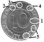 Serif on lower left of character N in SLOVENIA (detail 2); full circle left of the date (detail 1); character A in SLOVENIA with low serif (detail 3); small serif on D in DESET (detail 4); no groove on lower left part of characters L, R and E (detail 5) |