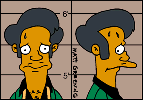 Apu Nahasapeemapetilon is the owner of the Kwik-E-Mart, Springfield's finest convenience store. He is always there. He is always polite to his customers and he constantly bribes the police to turn their backs on any illegal activity. He is good friends with Paul and the late Linda McCartney, who stop by his vegetarian haven whenever they come to Springfield. The secret staircase is behind the non-alcoholic beers. His hot dogs are made of tofu, and no one is the wiser. Homer once offered his god, Ganesh, a peanut. The Kwik-E-Mart is the only place in town that sells Squishies. They are the coolest drink in town.