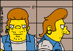 Snake is the scariest criminal that the law has to deal with. Once he stole Police Chief Wiggum's wallet by telling him that it was a wallet check. But my all time favorite Snake moment was when he was watching Bart and Lisa's hockey game and they hugged instead of fighting against each other. He said, as a single tear trickled down his cheek, "If only they had had pee-wee hockey when I was a lad. Oh, well!" and he started tearing up the place in true hockey fan style.