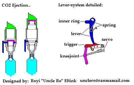 When the lever (deep blue) moves a little, the inner ring (also deep blue) wil turn a little, to release the piston (purple) wich would otherwise be pushed by the inner ring on to the rubber O-ring (red). When the piston is released, it’ll be launched into the cylinder by the CO2 gas from the flask (lightblue). The cylinder will be pushed out by the gas and the force of a piston flying against the end of the cylinder.