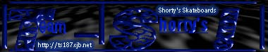 Team Shorty's was formed on January 13th of 2000 right after I screwed up on my last web page, a web page on NOFX. I accidentaly deleted it, so i decided to create a web page on my favorite Skateboard company, Team Shorty's. The point of the Team Shorty's is the fact of Chad Muska, Peter Smolik, and Steve Olson riding on the same team (Shorty's..) and they are my favorite skaters, so I named it to represent them.