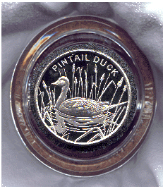 The Pintail Duck one ounce silver round is featured in this beautiful heavy duty glass dome paperweight. This different kind of paperweight would make a practical gift for your dad or mom, aunt or uncle, grandfather or grandmother. The uncirculated coin contains one ounce of pure silver. The thick high quality glass dome is 3 inches in diameter with a thin layer of cork attached to the bottom to prevent scratching.